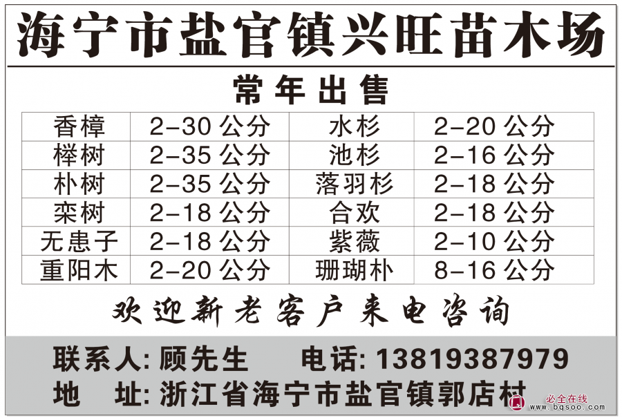 浙江海宁市盐官镇兴旺苗木场主营2-30公分香樟、2-35公分榉树、2-35公分朴树、2-18公分栾树、2-18公分无患子、2-20公分重阳木、2-20公分水杉、2-16公分池杉、2-18公分落羽杉、2-18公分合欢、2-10公分紫薇、8-16公分珊瑚朴等。本场服务宗旨:重合同、守信誉、质量好、价格低,欢迎新老客户光临指导,洽谈业务! |